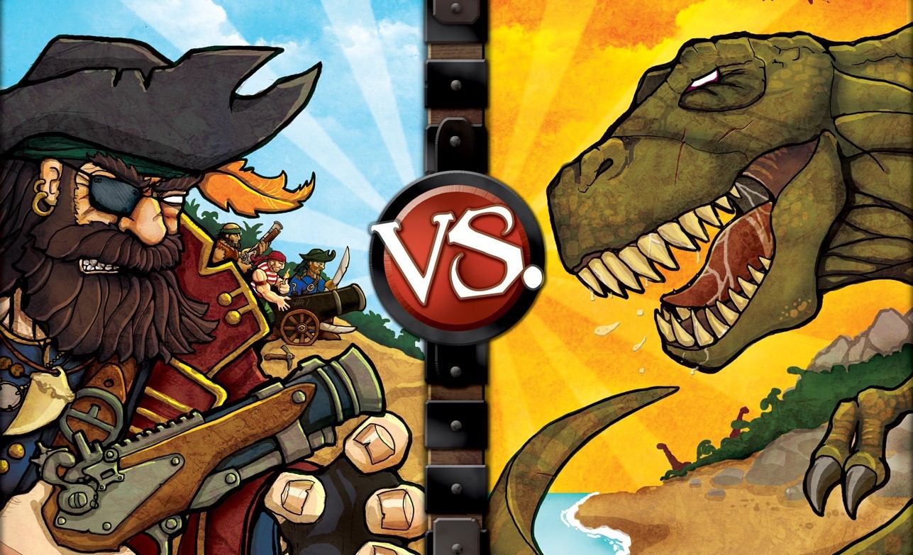 Well, today we’re looking at his newest game, Pirates vs. Dinosaurs, and I’m going to be eating my words. Or at least some of them.